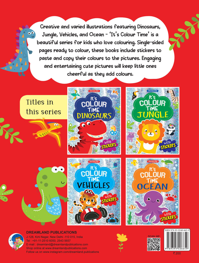 Creative and varied illustrations featuring Dinosaurs, Jungle, Vehicles and Ocean- ‘It’s Colour Time’ is a beautiful series for kids who love colouring. Single-sided pages ready to colour, these books include stickers to paste and copy their colours to the pictures. Engaging and entertaining cute pictures will keep little ones cheerful as they add colours.