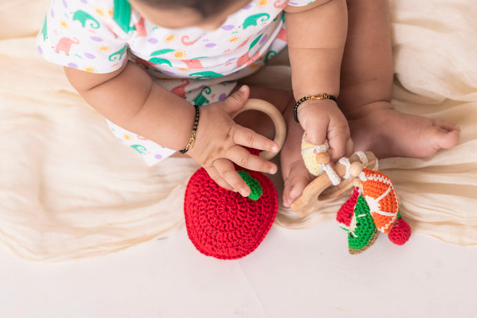 WOODEN RATTLE AND TEETHER WITH CROCHET BEADS IS A CAPTIVATING TOY DESIGNED SPECIFICALLY TO STIMULATE YOUR CHILD AND ENSURE TO CAPTURE AND SLOWLY HELP THEM FOCUS THEIR ATTENTION TOWARDS THE SOUND. CRAFTED WITH UTMOST CARE AND ATTENTION TO DETAILS, THIS DELIGHTFUL TEETHER AND RATTLE OFFERS A PERFECT COMBINATION OF FUNCTIONALITY, SAFETY AND AESTHETIC APPEAL. THESE WOODEN RATTLE IS A GOOD GRASPING AID AND VERY SAFE FOR YOUR BABIES.
