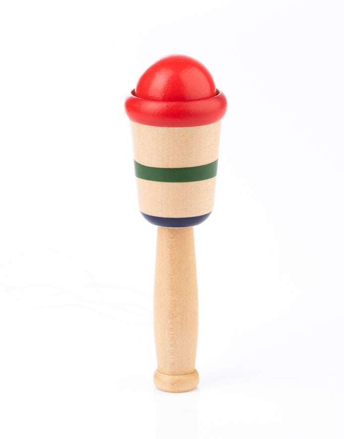 The Cup & Ball game has been a favorite toy for many generations. Examples of the Cup & Ball game have been found all over the world from as early as the 16th Century. It consists of a wooden handle with a ball tethered to one end, and a small cup on the other end. The object of the game is to swing the ball into the cup- not an easy task!