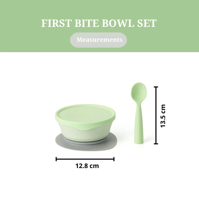 First Bites Set Includes: 1x cereal bowl, 1x silicone lid, 1x training spoon, and 1x detachable suction foot                                                                                    Dimensions: Bowl with Lid and Suction foot - 13.5 x 12.8 x 5.9 cm(H) Spoon - 3.3 x 2.4 x 13.5 cm(H)