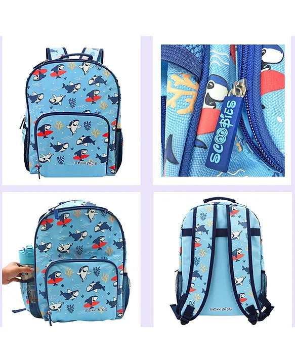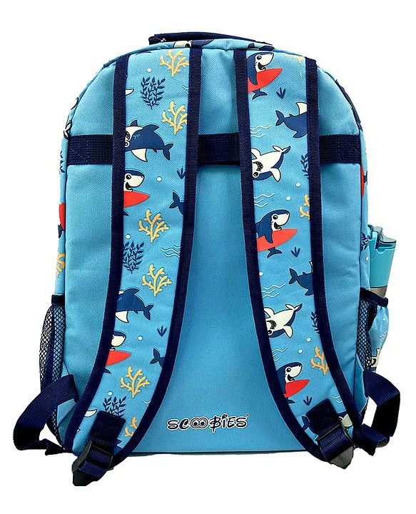 • Cool & Trendy Design: A stylish blue bag featuring sharks, skateboards, coral, and other fun elements. The soft blend of pastel blue and navy is designed with kids in mind.