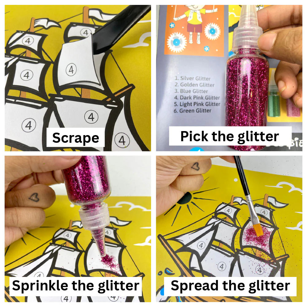 - How to Use - For every number, there is a corresponding glitter. Pick up a design card of your choice. The entire composition is divided into different numbers. Peel the number using the spatula and use the same spatula to pour the corresponding glitter and stick it on the required part using the brush. No glue or scissor is required!