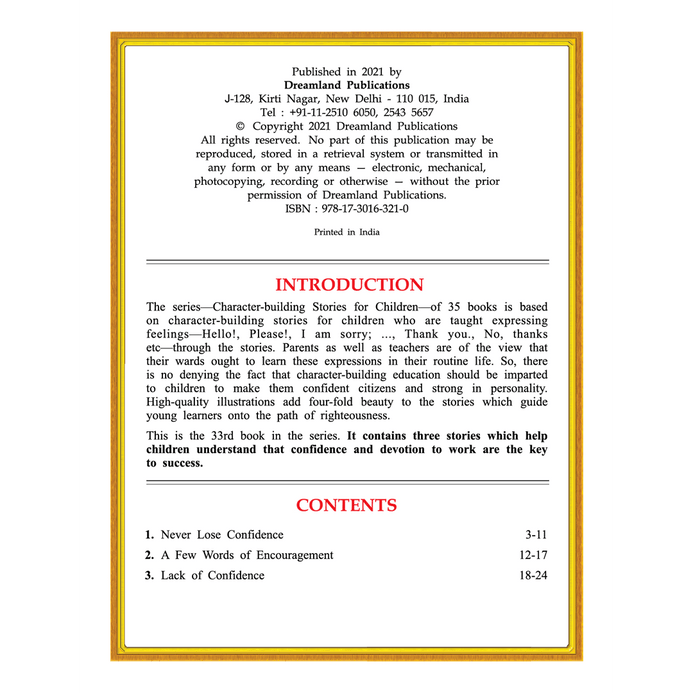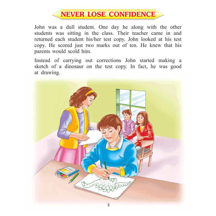 Character education is an integral part of education. ‘Character Building – Confident’ this book contains three stories that help children understand that confidence and devotion to work are the keys to success. These stories make it easy to teach moral values in a meaningful way. • Ideal for ages 6-8 • 24 pages • Includes moral lessons • Colourful presentation • Nice cover design Designed and compiled keeping young kids in view lessons learnt through these interesting stories will definitely help children become confident citizens. Nice illustrations add beauty to each story that also guides young learners on the path of righteousness. It is an excellent resource for character-conscious kids.
