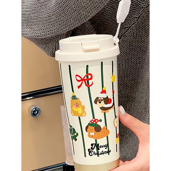 1. Christmas Designed Mug: Celebrate the festive spirit with this adorable insulated travel mug, featuring cute puppies and teddy dressed in Santa hats, scarves, and holiday accessories. A joyful and stylish Christmas water bottle for kids and adults who love festive drinkware.