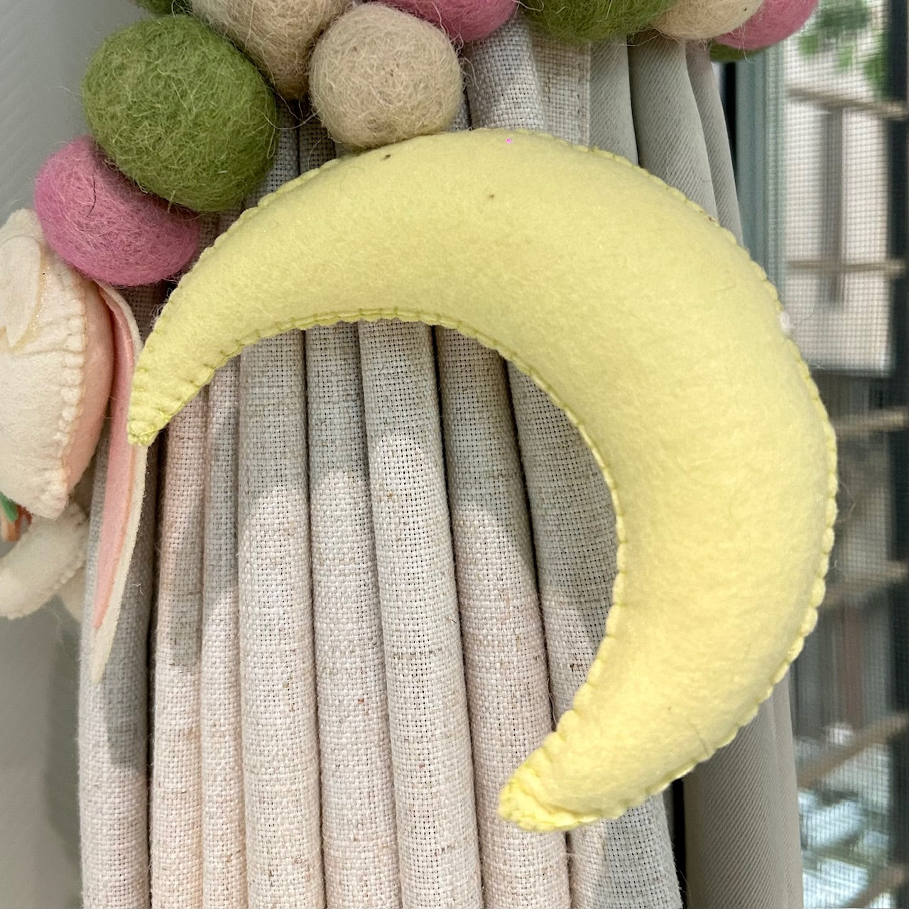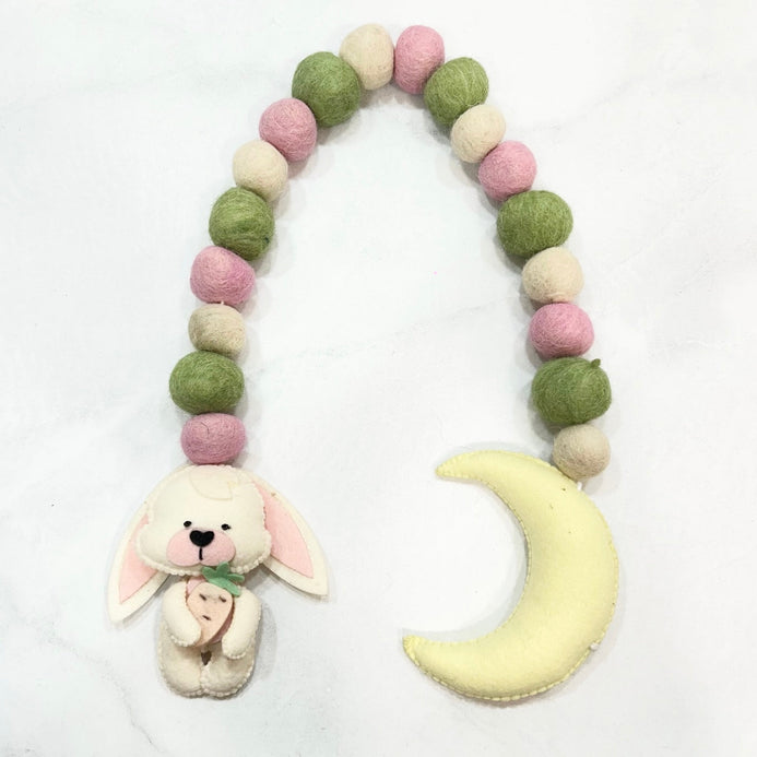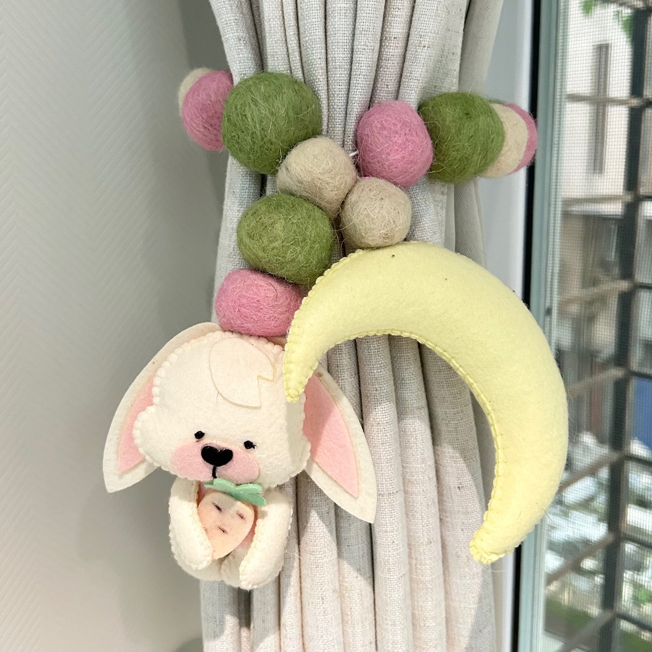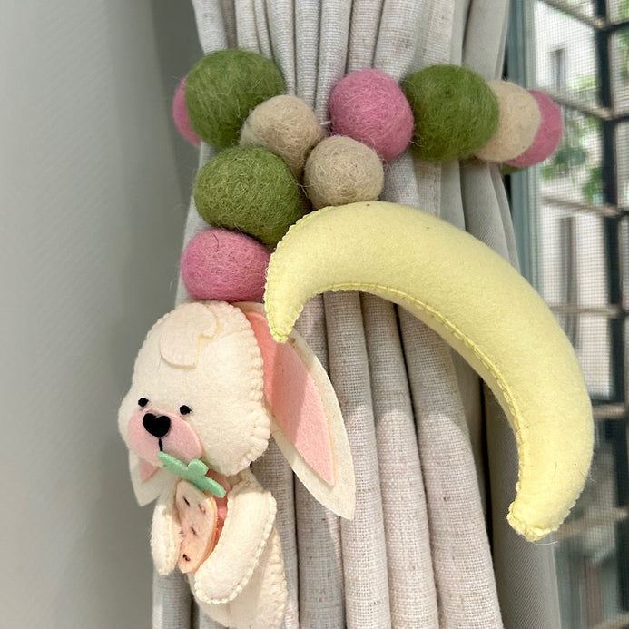 Transform your child's room with our enchanting Bunny With a Carrot themed Curtain Tie. In soothing shades of White, Pink, Orange, Green and Lemon Yellow, these delightful accessories not only keep curtains neatly in place but also add a charming touch to the decor. Handstitched and beautifully crafted, they're the perfect blend of functionality and fun for your little one's space!