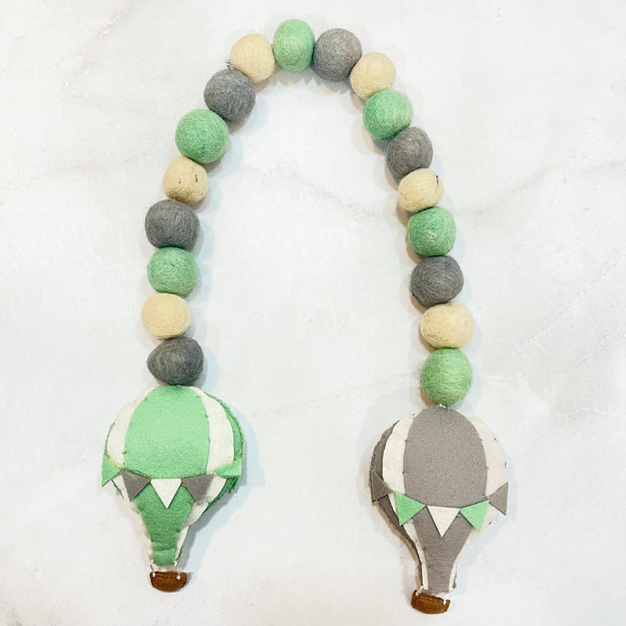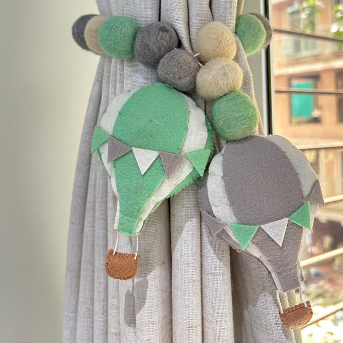 Transform your child's room with our enchanting Hot Air Balloon themed Curtain Tie. In soothing shades of Green, White, Brown and Gray, these delightful accessories not only keep curtains neatly in place but also add a charming touch to the decor. Handstitched and beautifully crafted, they're the perfect blend of functionality and fun for your little one's space!