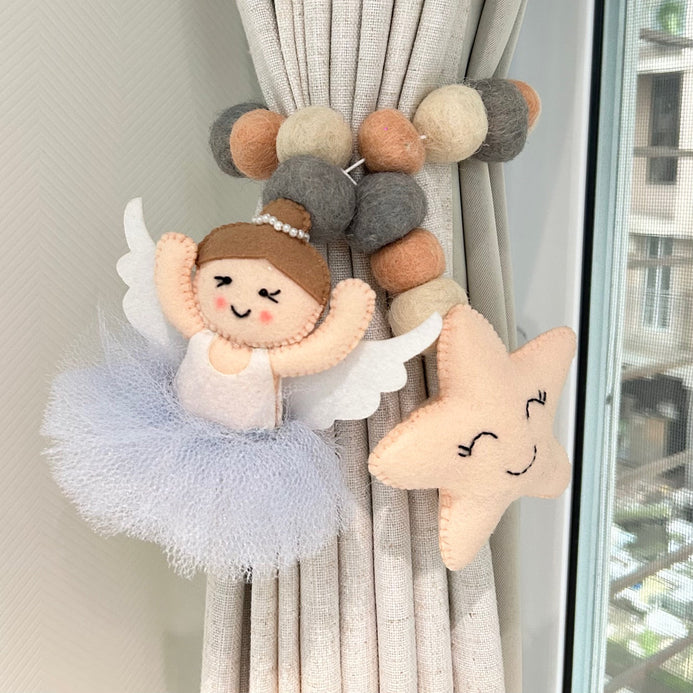 Transform your child's room with our enchanting Fairy themed Curtain Tie. In soothing shades of Purple, Gray, Peach and White, these delightful accessories not only keep curtains neatly in place but also add a charming touch to the decor. Handstitched and beautifully crafted, they're the perfect blend of functionality and fun for your little one's space!