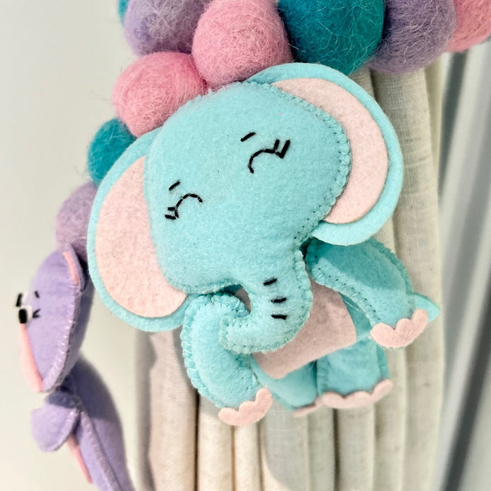 Transform your child's room with our enchanting Hippo & Elephant themed Curtain Tie. In soothing shades of Purple, Pink, Blue and Peach, these delightful accessories not only keep curtains neatly in place but also add a charming touch to the decor. Handstitched and beautifully crafted, they're the perfect blend of functionality and fun for your little one's space!