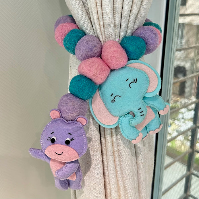Transform your child's room with our enchanting Hippo & Elephant themed Curtain Tie. In soothing shades of Purple, Pink, Blue and Peach, these delightful accessories not only keep curtains neatly in place but also add a charming touch to the decor. Handstitched and beautifully crafted, they're the perfect blend of functionality and fun for your little one's space!