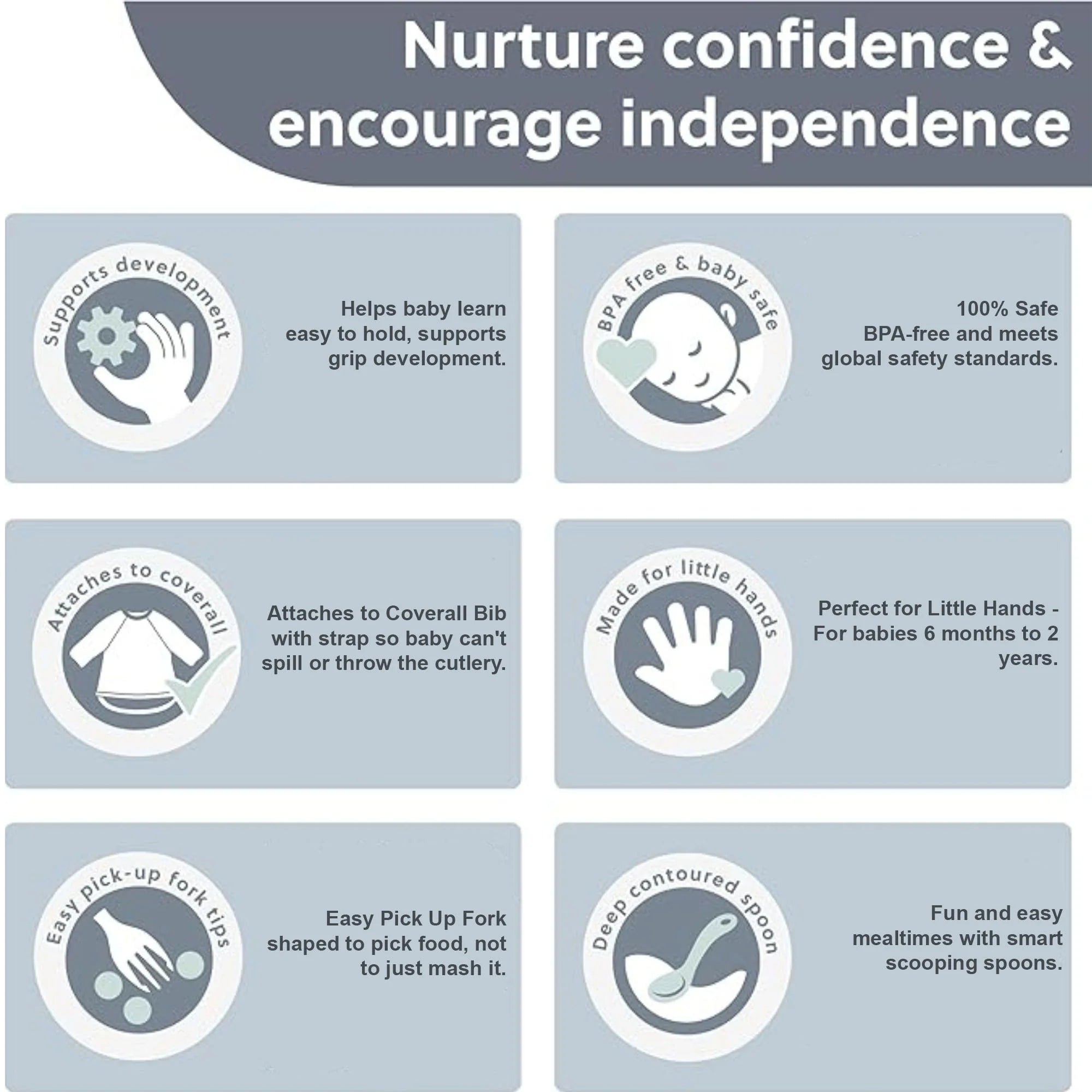 Handi Cutlery is perfect for making mealtime adventures easier and more enjoyable for everyone. It has lots of features to help your little one explore food and learn to use cutlery. It has a unique 'no drop' system by attaching to the Coverall Weaning bib, meaning no more picking up spoons and forks from the floor for you, or frustration for them. This aids your little one's development by allowing them to drop their cutlery as many times as it takes for them to get the hang of it. It's also ergonomically designed for little hands with easy grip handles, and the fork is specially shaped to pick up food rather than mash it.