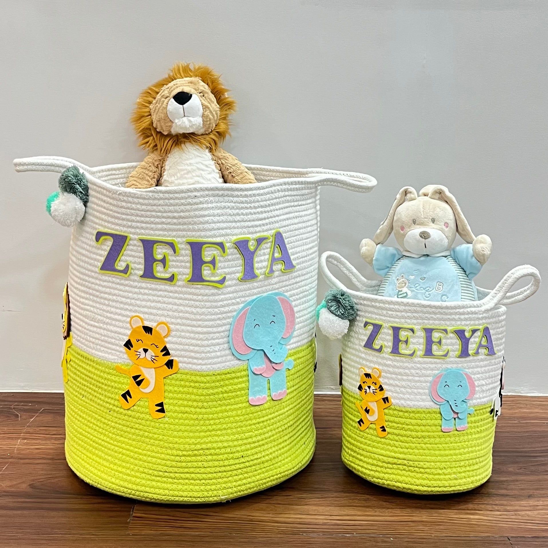 Our Basket crafted from durable jute and soft cotton, it offers both sturdiness and comfort. Perfect for carrying books, toys, or treasures from a galactic journey, this basket is as functional as it is enchanting. Elevate your child's storage with a sprinkle of cosmic magic and practicality, and let their imagination soar among the stars. This space theme basket in bright hues serves as a dual purpose of both kid's room decor as well as storage made easy with two convenient sizes and comes embellished with planets, astronaut, rocket and Earth.