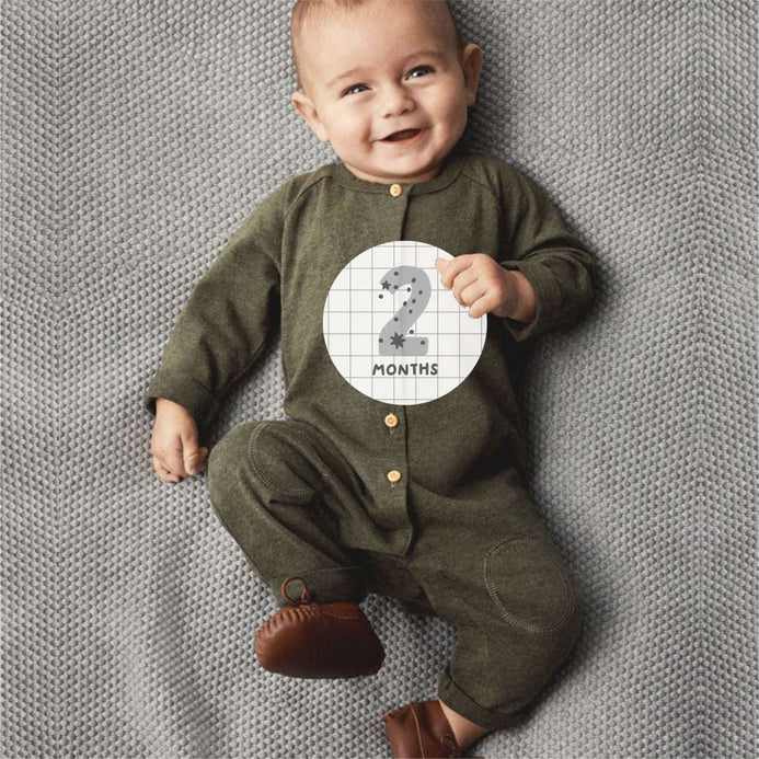 "- 12 stickers from 1 month to 1 year - Residue free so saves your clothes! Monochrome so it matches every backdrop!