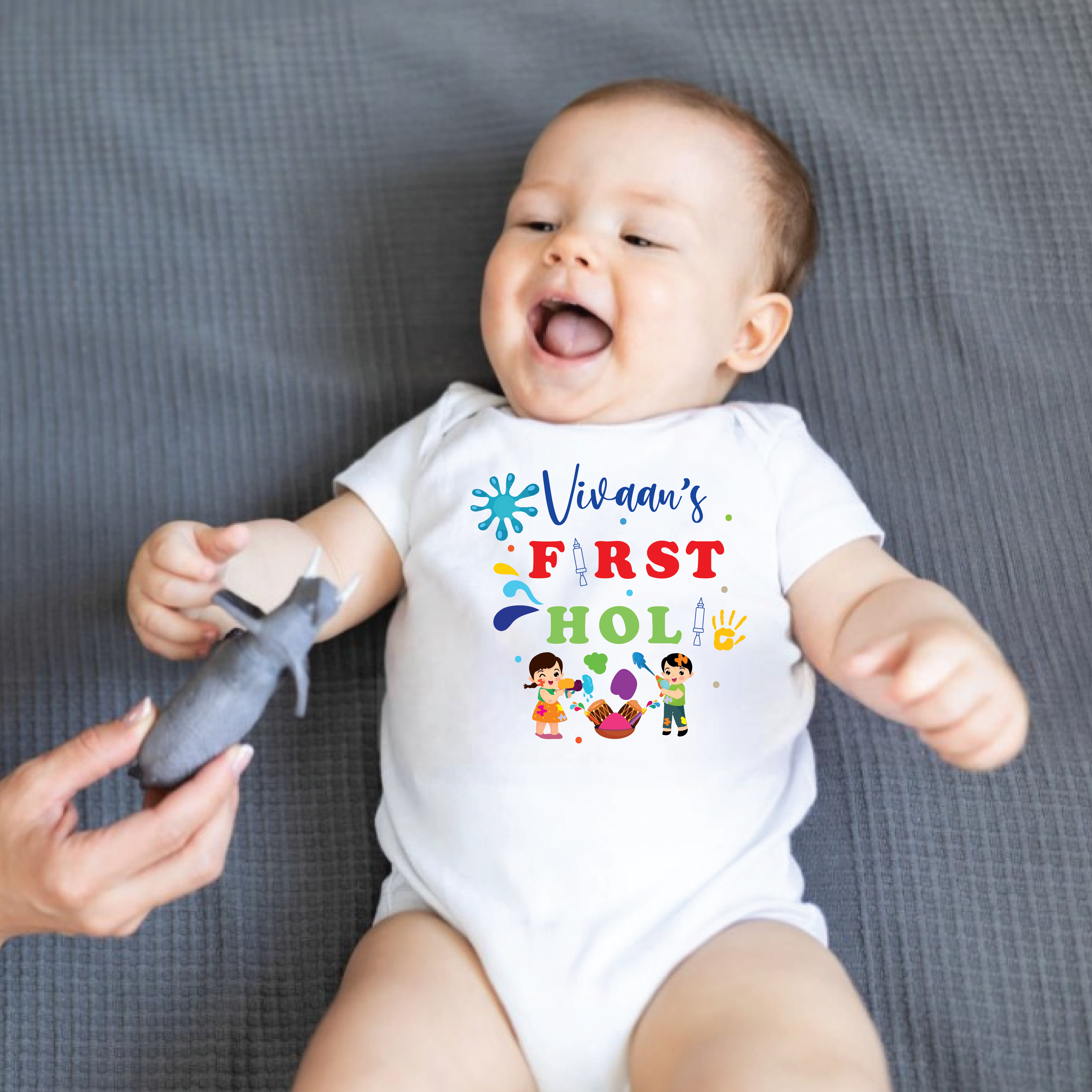 "Celebrate the festival of colors in style with our personalized Holi-themed rompers. Vibrant, playful, and perfect for every little one, these rompers bring the spirit of Holi to life with a custom touch. Bright, comfy, and ready for fun!"