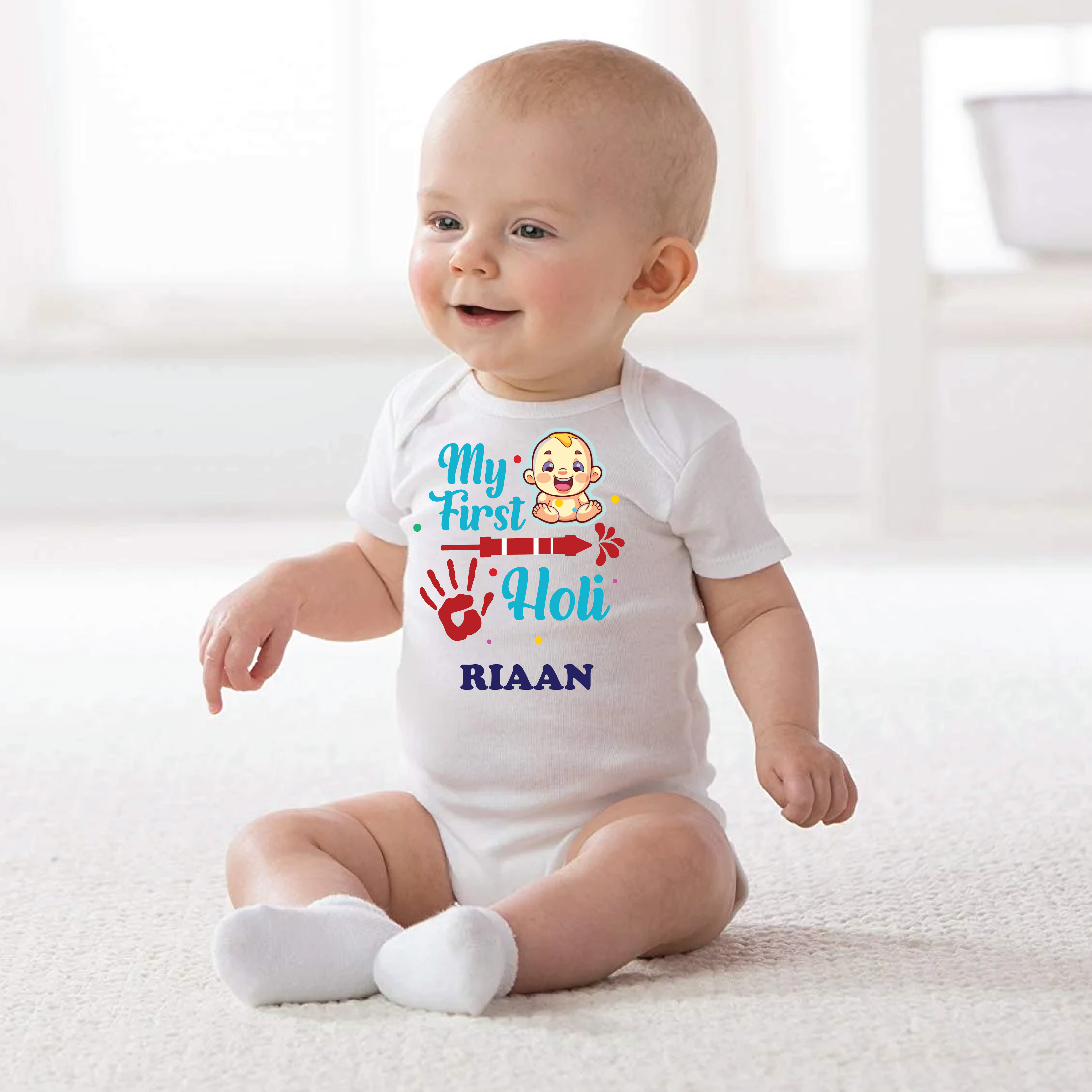 "Celebrate the festival of colors in style with our personalized Holi-themed rompers. Vibrant, playful, and perfect for every little one, these rompers bring the spirit of Holi to life with a custom touch. Bright, comfy, and ready for fun!"