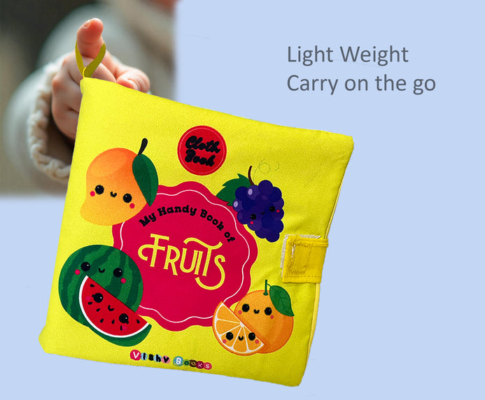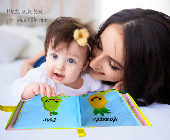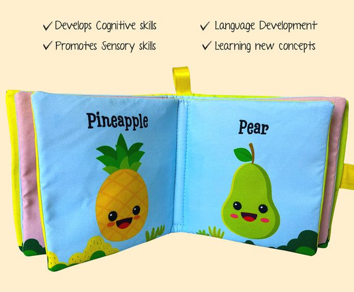 Bright, engaging, and safe for little hands—this delightful cloth book introduces children to a variety of fruits in a fun and interactive way. Designed to enhance sensory play and early word skills, it features soft fabric, vibrant illustrations, and a washable design to withstand everyday use. The book includes a fun way to learn about different fruits with colorful and engaging illustrations and encourages early word recognition. Pick it with the Vegetables and Numbers books for a full learning experience!