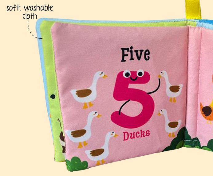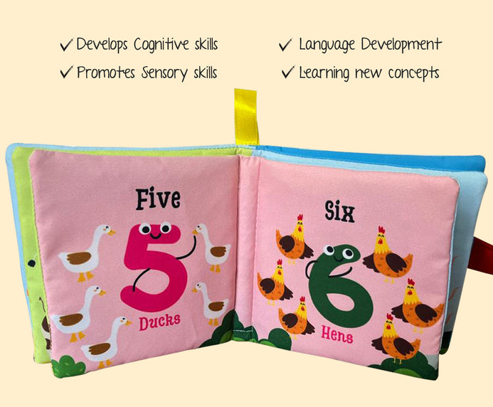 Make learning numbers an exciting adventure! This soft and durable cloth book is perfect for tiny hands to explore. Designed to introduce early counting, it supports sensory skills, hand-eye coordination, and language development. The bright and engaging illustrations help children recognize numbers in a fun way. Plus, it’s safe, washable, and long-lasting – ideal for everyday play! The book offers- Simple number recognition, Fun illustrations for early counting. Don't miss out! Also collect the Fruits and Vegetables books for a complete learning set!