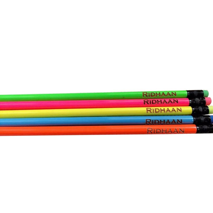 Our bright neon engraved pencils are topped with an eraser. Pack of 5 personallised pencils will have same text engraved.