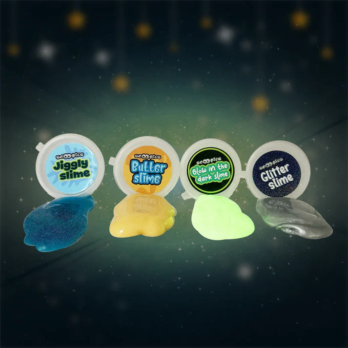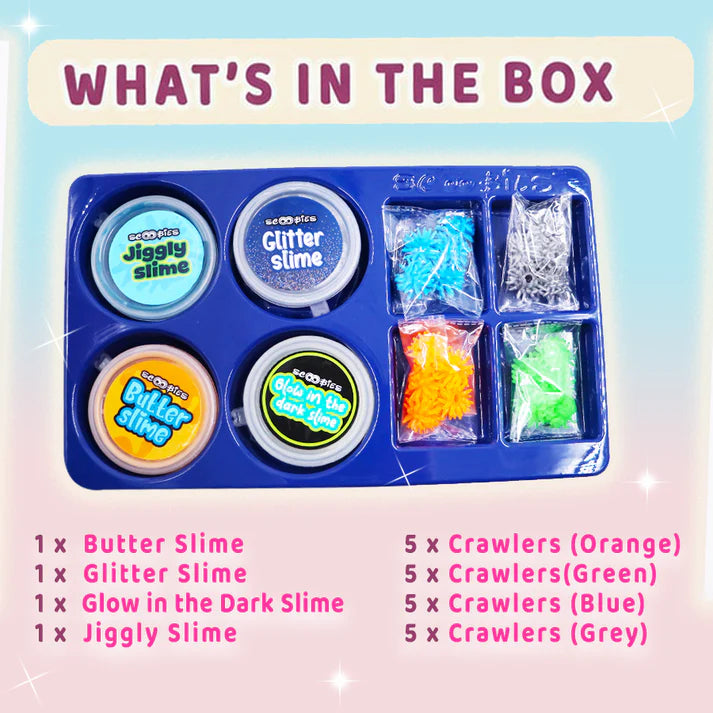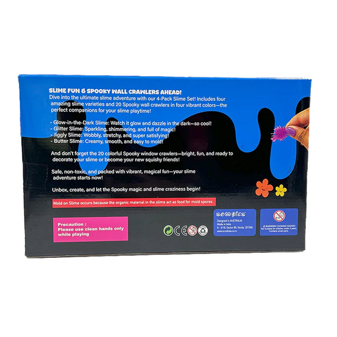 - Pack Includes: Four different types of slime (Glow-in-the-Dark, Glitter, Jiggly, Butter Slime) and 20 Spooky Wall Crawlers in four vibrant colors (5 of each).