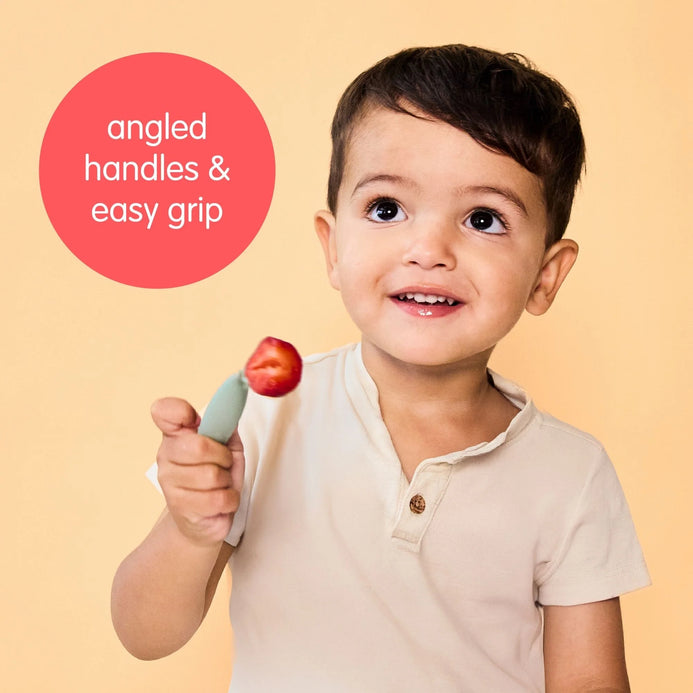 Our cutlery set has been designed with a leading pediatric occupational therapist (OT) as the ideal toolkit for tots who are ready to self-feed. The unique spoon shape acts as a shovel helping little ones to scoop up their food, even with a flat plate. The unique deep scoop spoon shape and angled handles encourage correct hand to mouth positioning, and help to contain food within the spoon as bubs practices bringing it to his/her mouth, which means more food makes it to the mouth and less mess! Our unique fork has been designed to fit the size and shape of little mouths. Its curved blunt prongs are gentler (and safer) on little mouths and gums. The set comes complete with a handy travel case to keep utensils clean before mealtime on the go, and after to prevent soiling in nappy bags or handbags.