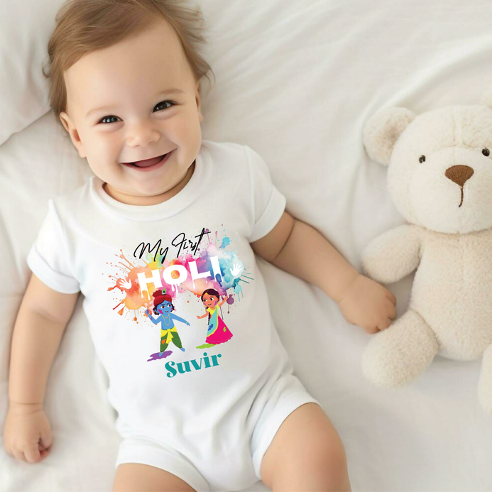"Celebrate the festival of colors in style with our personalized Holi-themed rompers. Vibrant, playful, and perfect for every little one, these rompers bring the spirit of Holi to life with a custom touch. Bright, comfy, and ready for fun!"