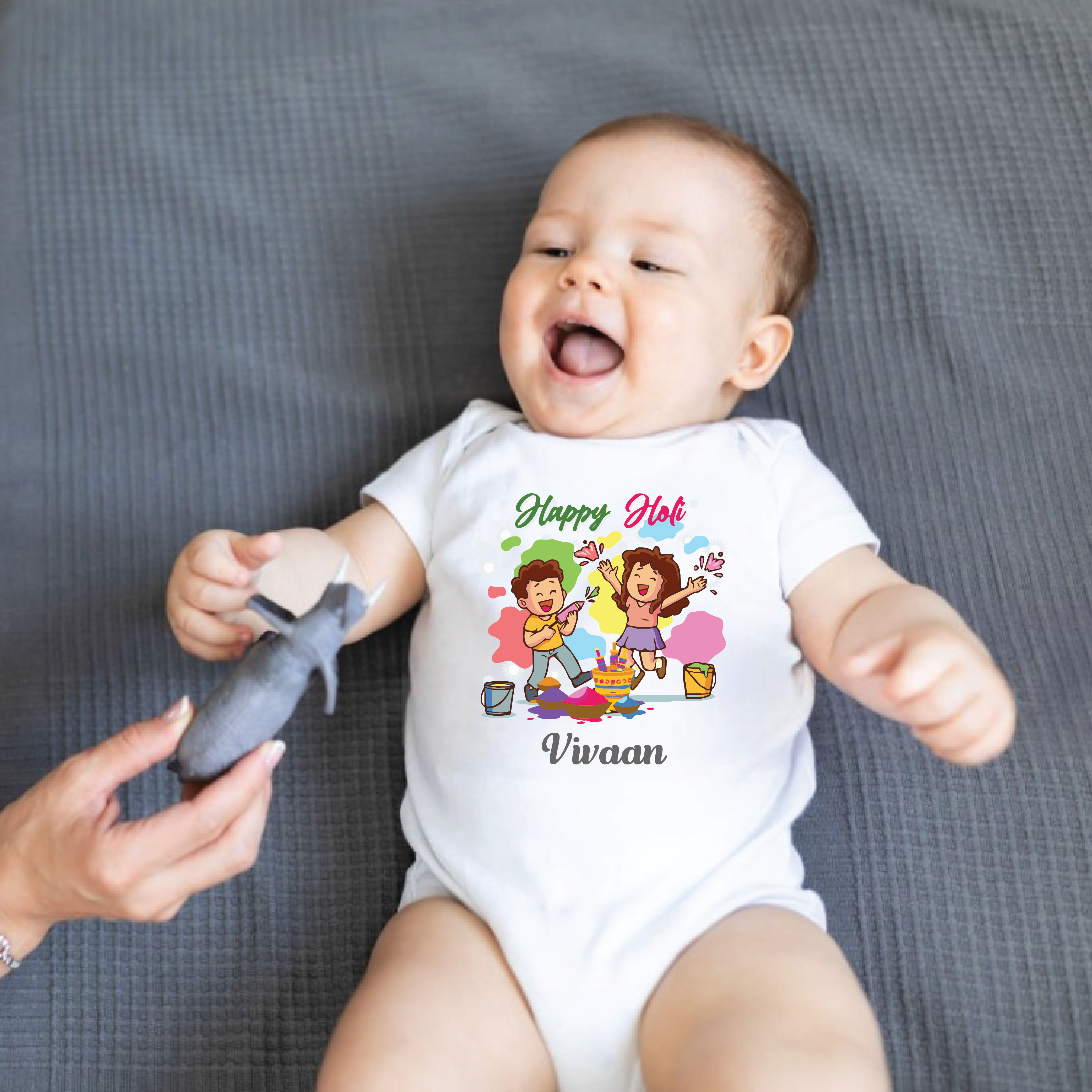 "Celebrate the festival of colors in style with our personalized Holi-themed rompers. Vibrant, playful, and perfect for every little one, these rompers bring the spirit of Holi to life with a custom touch. Bright, comfy, and ready for fun!"