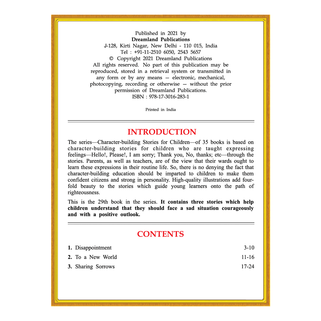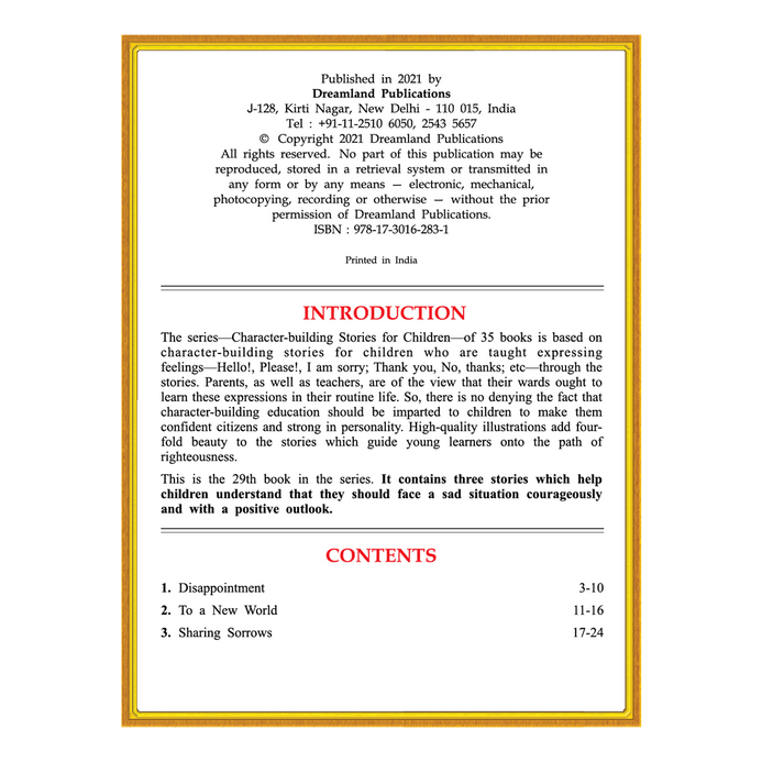 Character education is an integral part of education. ‘Character Building – Sad’ this book contains three stories that will help children understand that they should face a sad situation courageously and with a positive outlook. These stories make it easy to teach moral values in a meaningful way. • Ideal for ages 6-8 • 24 pages • Includes moral lessons • Colourful presentation • Nice cover design Designed and compiled keeping young kids in view lessons learnt through these interesting stories will definitely help children become confident citizens. Nice illustrations add beauty to each story that also guides young learners on the path of righteousness. It is an excellent resource for character-conscious kids.