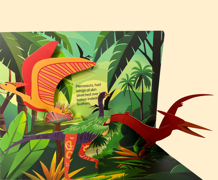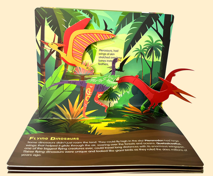 The book takes the reader into the fascinating world of dinosaurs as they pop out in an exciting adventure through time! This engaging book takes young readers on a journey to learn all about these prehistoric creatures—what they looked like, what they ate, and when they lived on Earth and allows the child to discover thrilling facts about the fierce Tyrannosaurus Rex, the powerful Triceratops, and many more incredible dinosaurs. Packed with fun facts and colourful visuals, this book makes learning about dinosaurs an unforgettable experience for kids. Perfect for little explorers who love adventure and discovery! Perfect pick to generate curiosity about books!