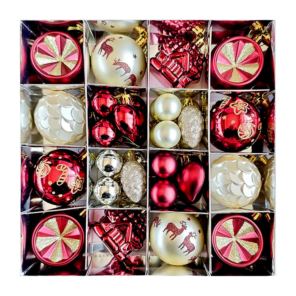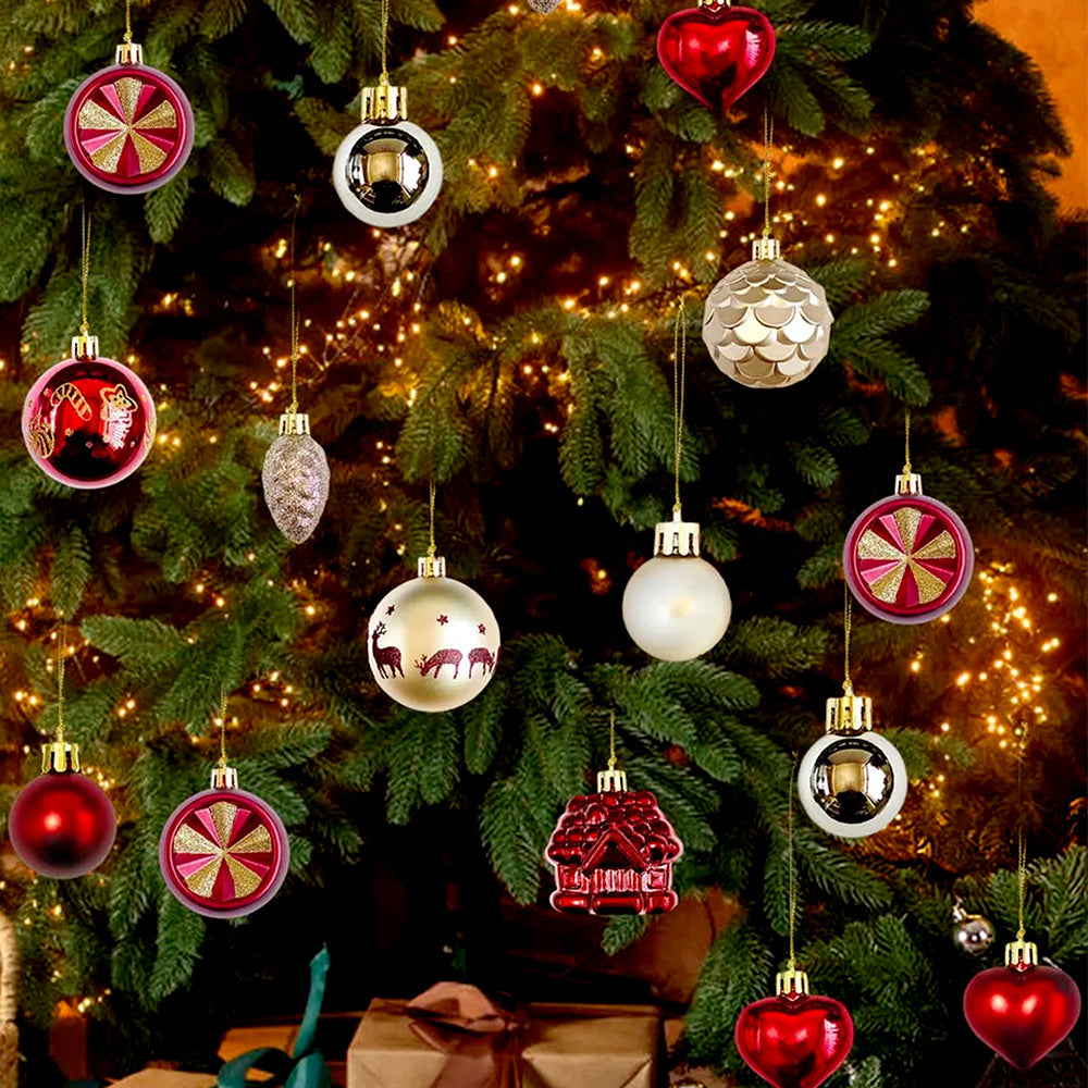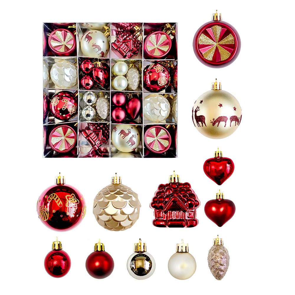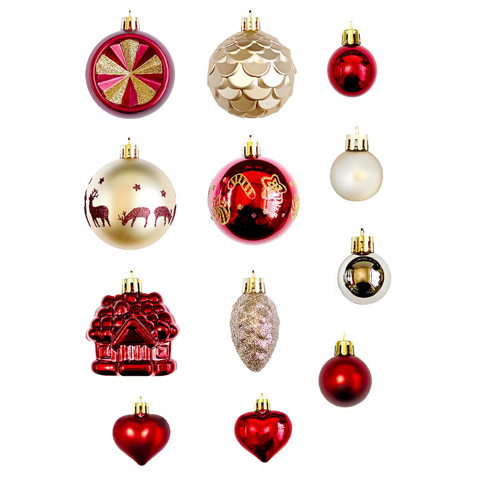 2. Gold Sequins with Red Themed Xmas Balls: This set includes 40 beautifully crafted ornaments inspired by rich Christmas elegance and sparkling festive accents. The collection features gold sequin-pattern baubles, glossy red balls, red hearts accents, textured pinecones, house-shaped ornaments, printed baubles and more. Each ornament is thoughtfully designed to bring a luxurious charm to your Christmas tree.