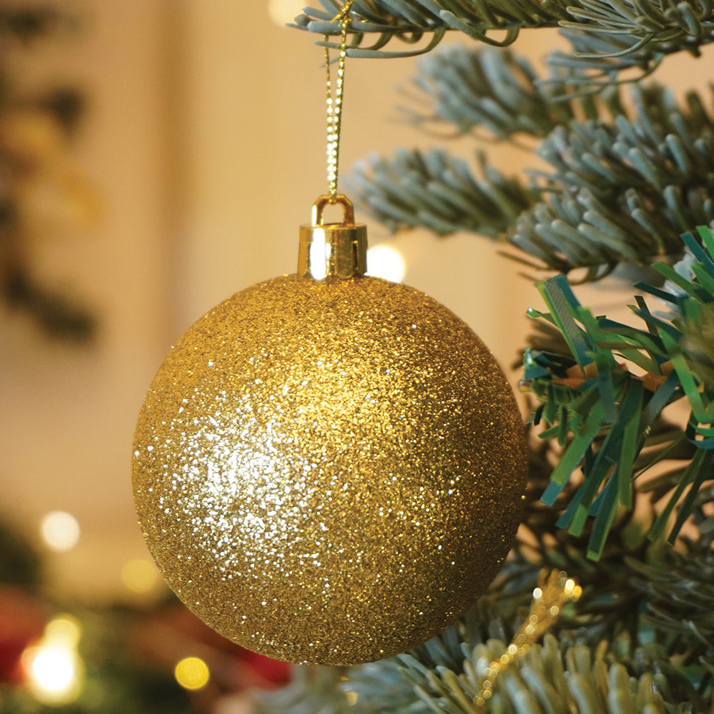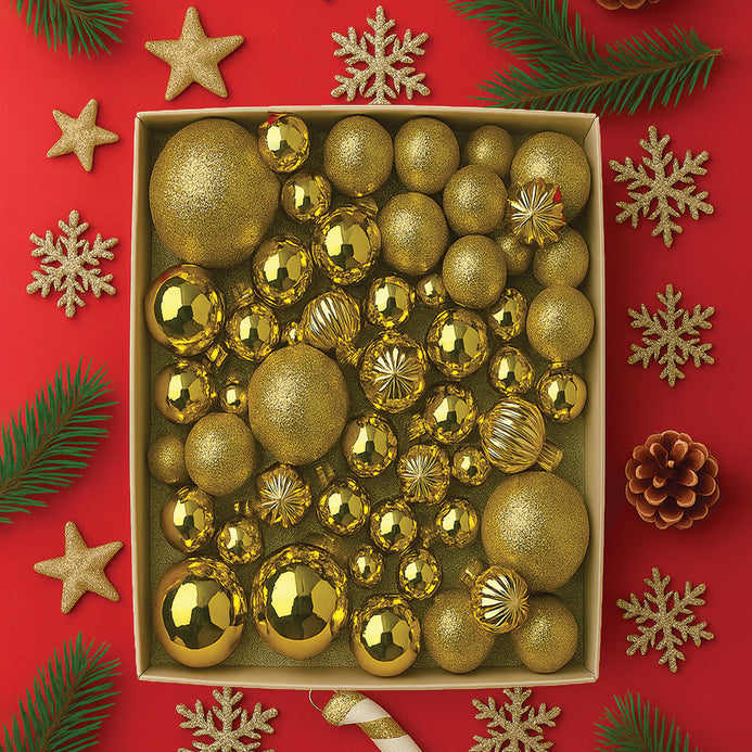 2. Gold Shiny Mix Themed Xmas Balls: This box is filled with 42 beautifully crafted ornaments inspired by luxurious festive styling. Each piece is a stunning blend of glossy gold baubles, glitter coated balls, reflective mirror-finish pieces, textured designs and more. Each ornament is crafted with rich detailing and a premium golden shine, making every piece stand out beautifully during the festive season.