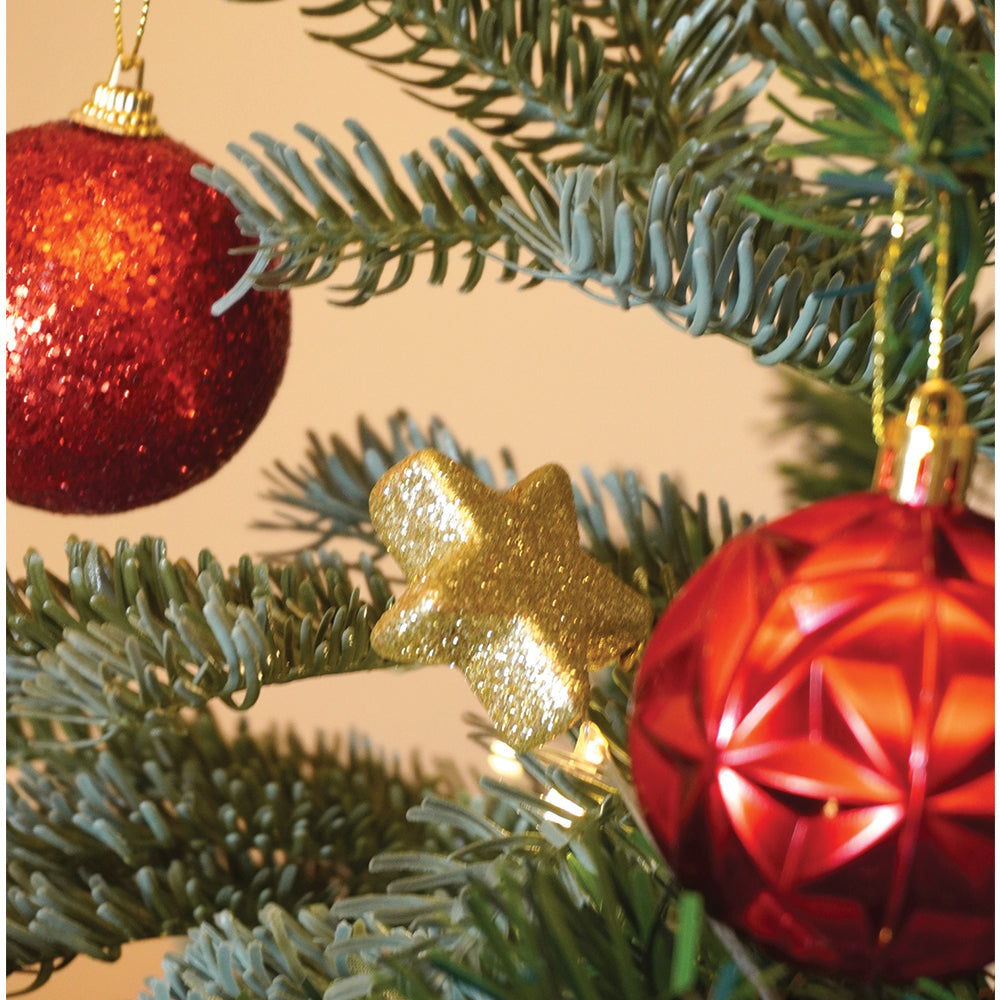 2. Champagne Gold & White Themed Xmas Balls: This set includes 64 beautifully crafted ornaments inspired by luxurious festive styling. Each peice is a stunning mix of glossy red baubles, glitter-coated gold balls, decorative stars, textured ornaments, candy-cane style hangings, swirl balls and more. Each ornament is crafted with rich detailing and vibrant finishes, making every piece stand out beautifully on your Christmas tree.