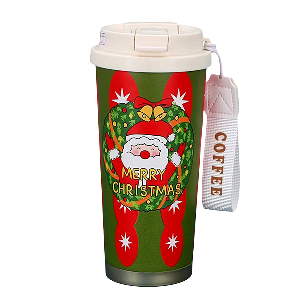 1. Christmas Designed Mug: Bring home the festive joy with this vibrant Santa Wreath Christmas Travel Mug, featuring a cheerful Santa surrounded by a holiday wreath, gifts, bells, stars, and bold red–green Christmas colours. A joyful and stylish Christmas water bottle for kids and adults who love festive drinkware.