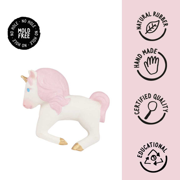 Stacy the Unicorn will make your baby sparkle wherever he goes! It will become babies and kids’ favorite teether, bath toy and sensory play toy. This chewable bracelet is meant to be placed around babies’ wrists while teething on it!