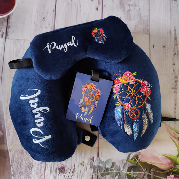 Travel in style with our Personalised travel set combo. The set includes neck pillow, eye mask and bag tag. The neck pillow has a fiber filling. The bag tags is mdf base.