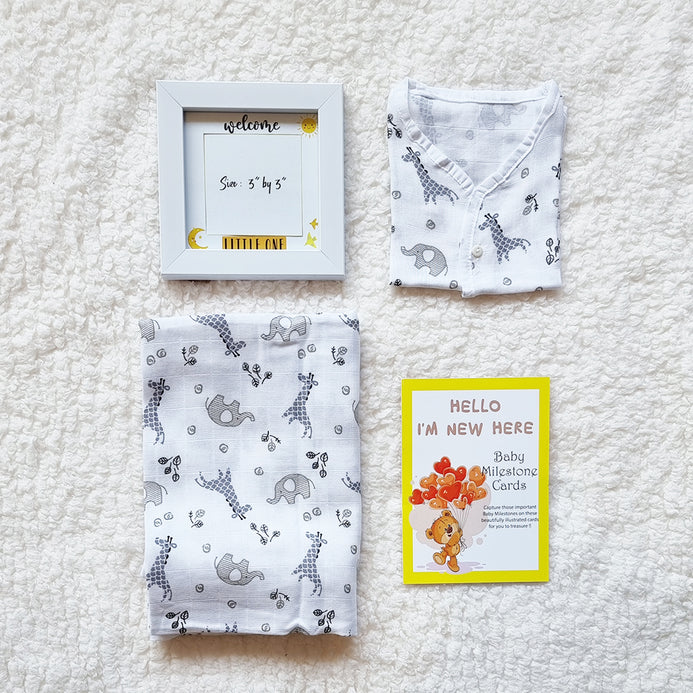 • It includes 1 Swaddle, 1 Jhabla, 1 Photo Frame and 9 Milestone Cards