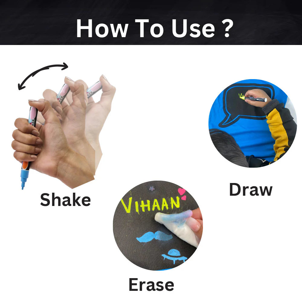 How to Use: Take a T-shirt of your size. Unfold it and place it on a smooth flat surface. Now, take the chalk marker of your choice and start doodling with the help of the stencil provided with this kit. You may use this chalky surface to make an annoucement, write your name & contact details when going out, for cheering your favourite team in cricket or football match or just for doodling. Wait for a minute for the water-based ink to dry before wearing.