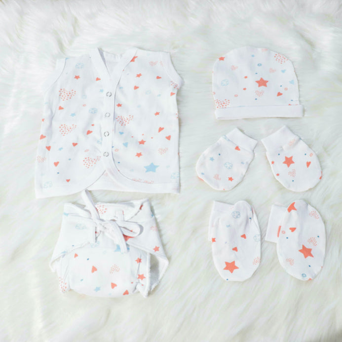 • Set of 7 - 1 cotton cap, 1 pair of mittens, 1 pair of booties, 1 Vest (Jhabla) & 1 Nappy.
