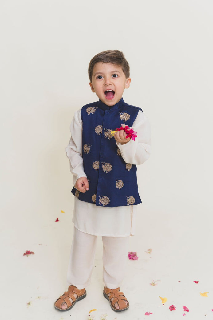 Hand Embroidered Navy Blue Cotton Glaze Jacket With White Cotton Kurta Pyjama.