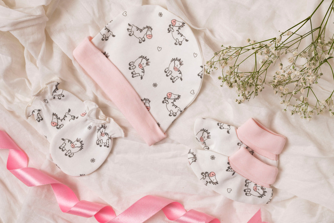 The cute cap, mittens and booties set is perfect for all around the year. It is made from extremely soft and breathable cotton making it essential for your little one.