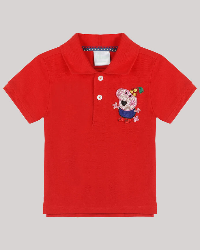 Red Polo T-Shirt With Hand- Embellished George Motif