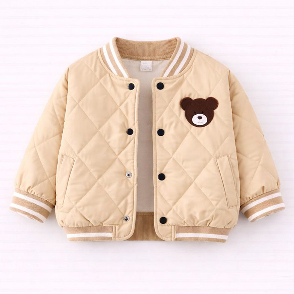 1. Smart & Stylish Design: This adorable winter set features a soft beige quilted jacket highlighted with a cute teddy bear patch on the front, adding a playful and charming touch. It is layered over a printed inner t-shirt and paired with matching textured pants featuring pocket detailing, creating a cozy yet stylish look for little ones.