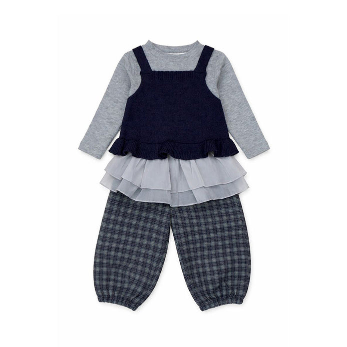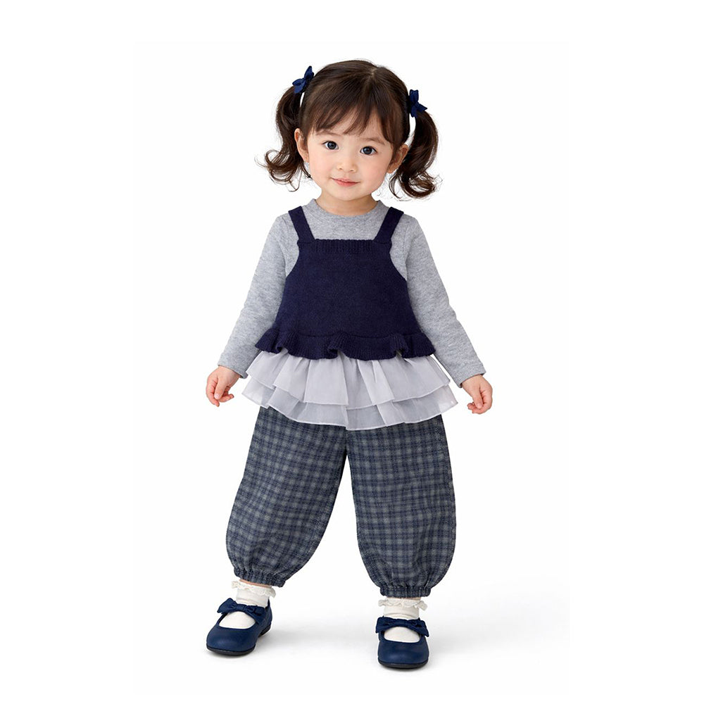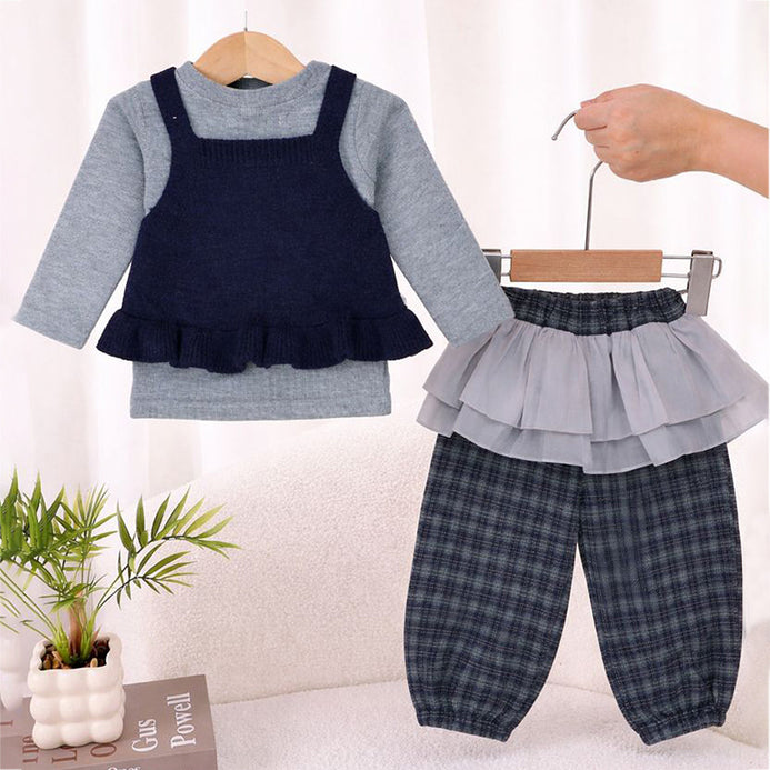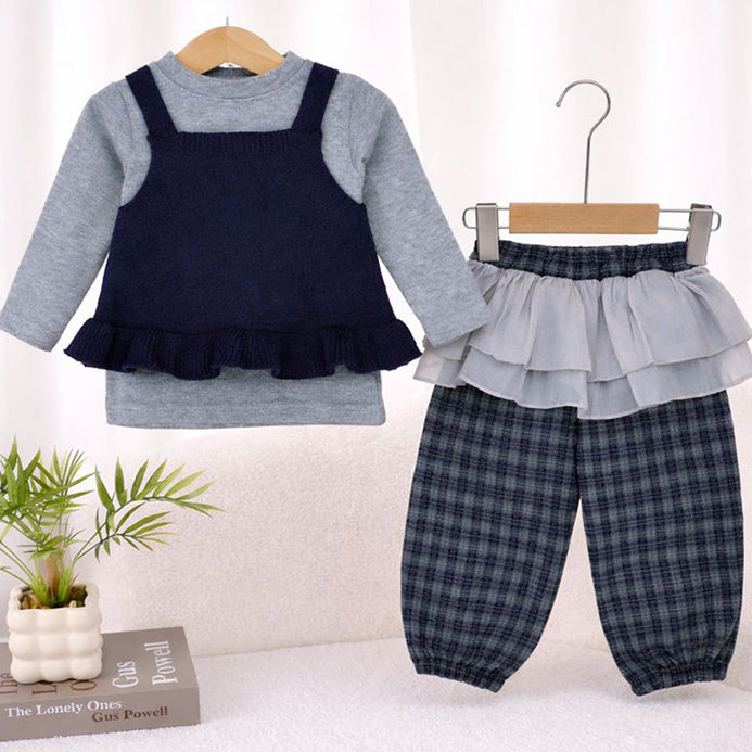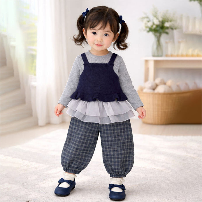 1. Adorable Design: This adorable set features a soft grey full-sleeve inner top layered with a navy blue peplum-style top, paired with grey check-patterned pants finished with delicate frill detailing at the waist. Soft Material: The fabric is soft, gentle on the skin, and comfortable for all day wear.