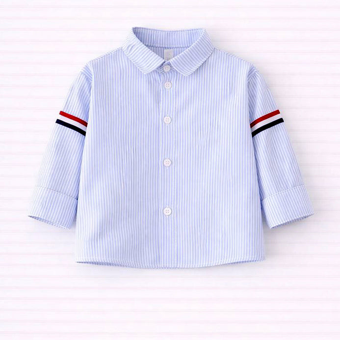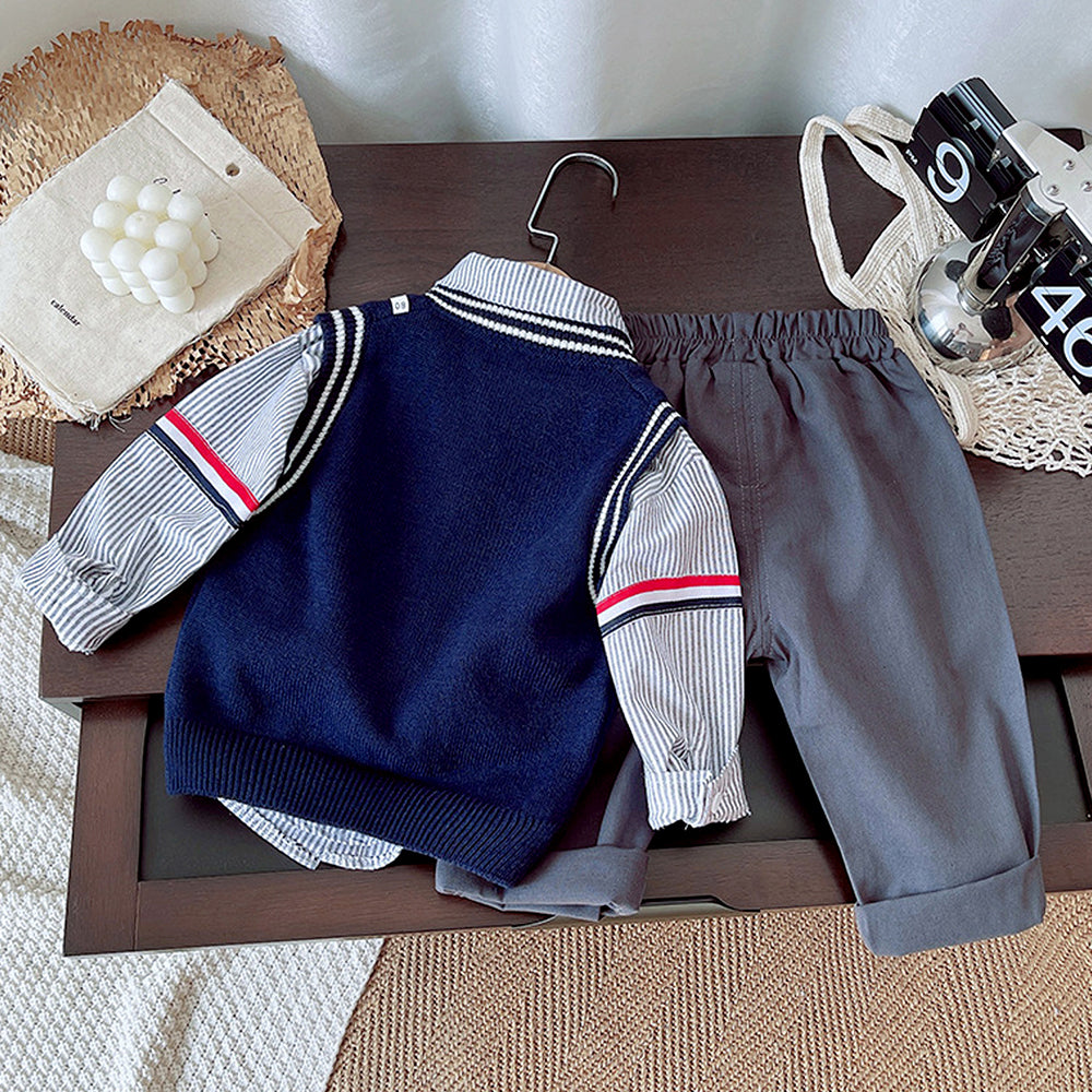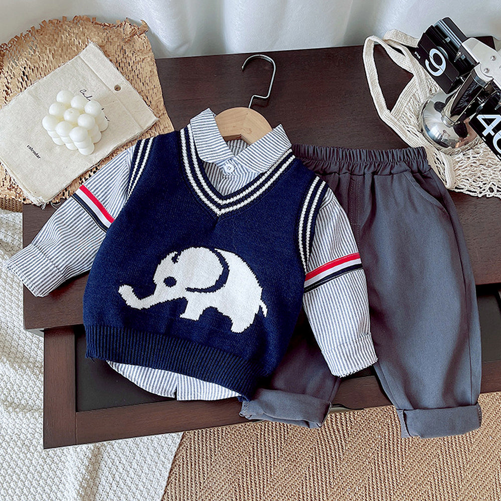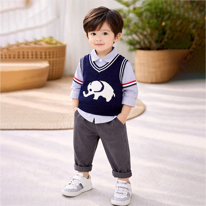 1. Smart & Stylish Design: This stylish set features a soft light blue full-sleeve stripes inner shirt layered with a navy blue sleeveless knit vest highlighted by a cute elephant at the front. The contrast trim on the vest adds a classic touch, while the outfit is paired with solid grey pants. The playful animal detail combined with smart layering creates a timeless yet adorable style..