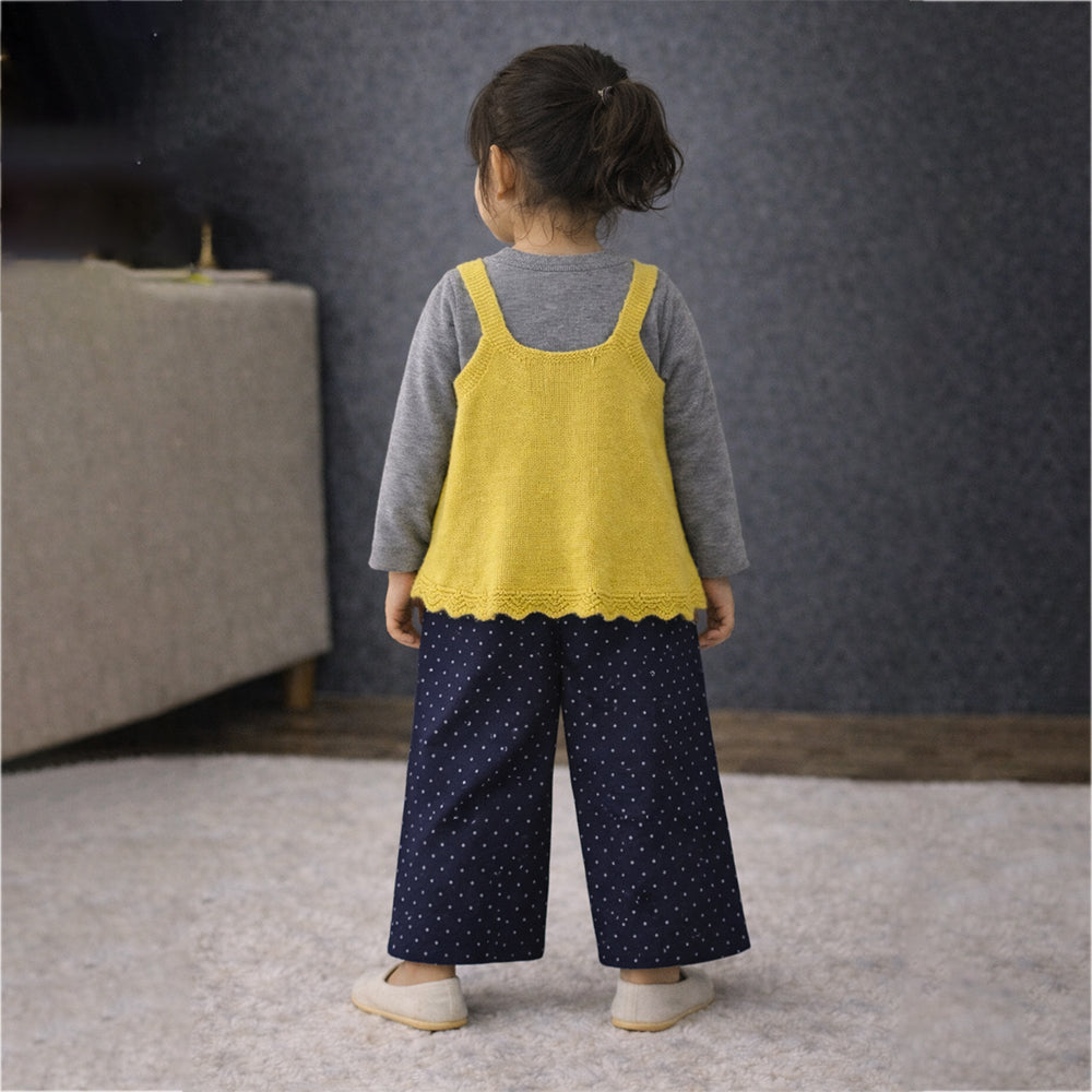 1. Elegant Layered Design: This adorable set features a soft grey full-sleeve inner top layered with a bright yellow knit camisole-style top overlay. The top is highlighted with a cat patch at the front, adding a playful and cheerful touch. It is paired with navy blue wide-leg pants adorned with delicate white polka dots, creating a charming look.