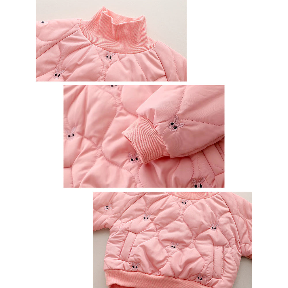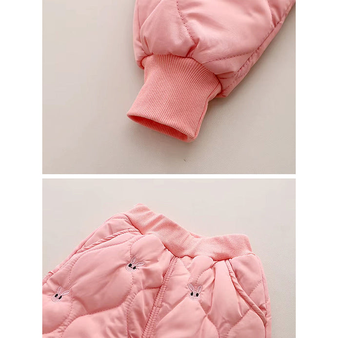 1. High Neck Design: This adorable baby winter set features a soft pink quilted jacket with front pockets, a high neckline, and delicate rabbit embroidery, paired with matching quilted pants. The cozy design and subtle accents create a cute and elegant look, perfect for winter days.