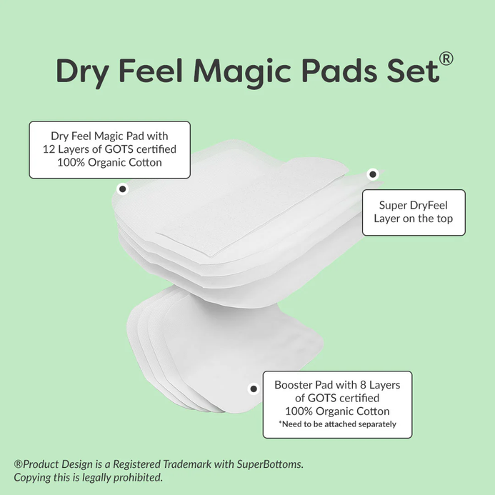 Dry Feel Magic Pad consists of 12 layers (after folding) of GOTS Certified 100% Organic Cotton with a Super DryFeel layer on top to keep baby’s bum dry. Booster Pad is made of 8 layers of Organic Cotton to be used in addition to the Dry Feel Pad for boosting the absorbency of the SuperBottoms Freesize UNO making it ideal for 12 Hour absorbency. Foldable design to make the pads dry very fast making it ideal for monsoon, winter seasons.
