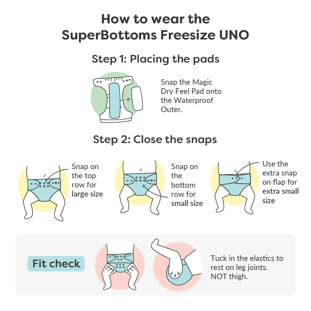 Dry Feel Magic Pad consists of 12 layers (after folding) of GOTS Certified 100% Organic Cotton with a Super DryFeel layer on top to keep baby’s bum dry. Booster Pad is made of 8 layers of Organic Cotton to be used in addition to the Dry Feel Pad for boosting the absorbency of the SuperBottoms Freesize UNO making it ideal for 12 Hour absorbency. Foldable design to make the pads dry very fast making it ideal for monsoon, winter seasons.