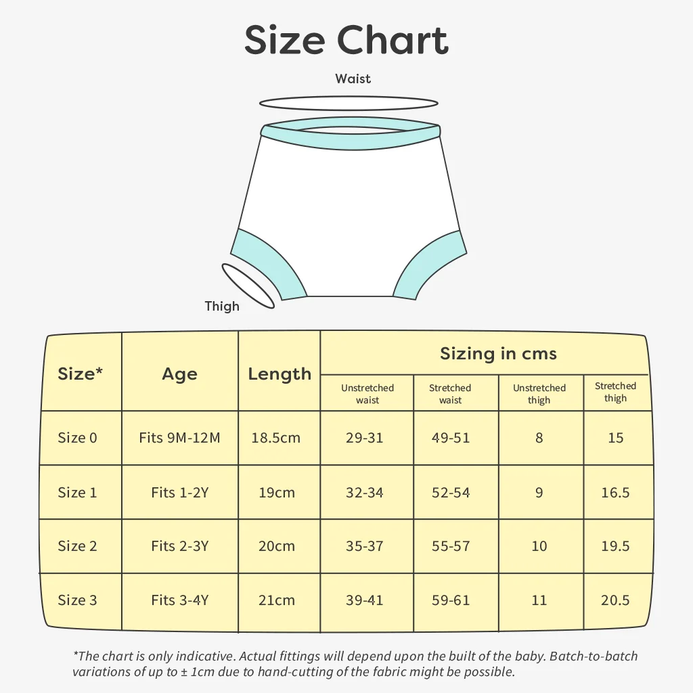 Available in various sizes (SIZE 0 for 9-12 Months, SIZE 1 for 1-2 years, SIZE 2 for 2-3 years, SIZE 3 for 3-4 years), these training offer a comfortable and practical solution for your toddler's transition. (Please refer to the size chart as each baby's body type may vary.)
