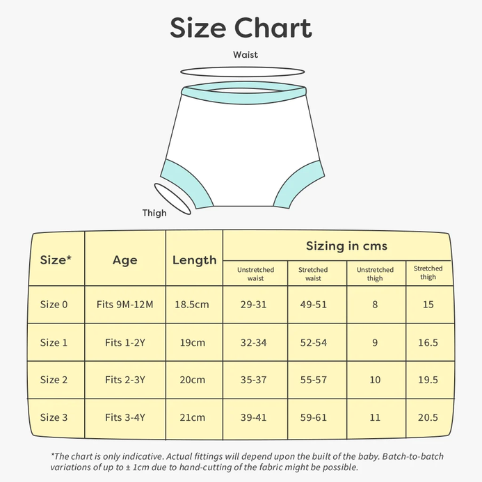 Available in various sizes (SIZE 0 for 9-12 Months, SIZE 1 for 1-2 years, SIZE 2 for 2-3 years, SIZE 3 for 3-4 years), these training offer a comfortable and practical solution for your toddler's transition. (Please refer to the size chart as each baby's body type may vary.)