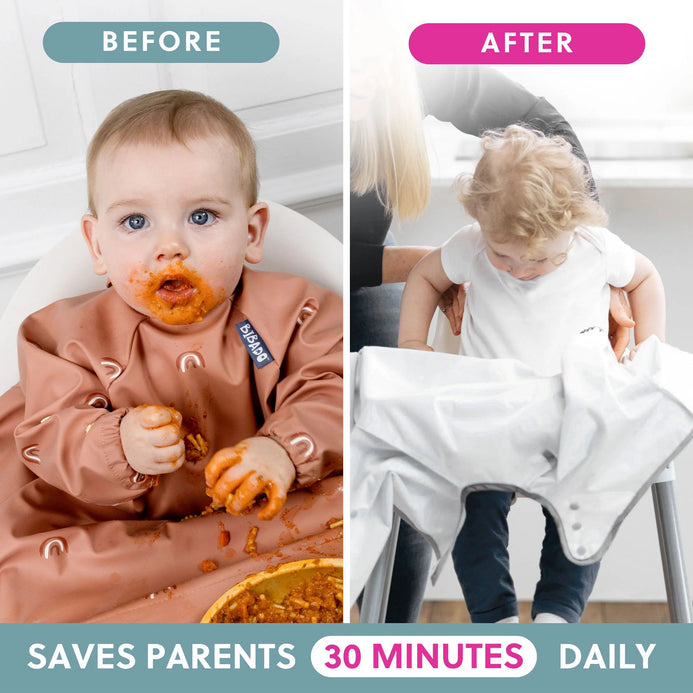 Introducing our amazing long sleeve feeding bibs for babies and toddlers by Bibado - the ultimate solution for mess-free mealtimes and worry-free weaning adventures! Tired of those traditional silicone bibs that always lead to messy clothes and endless clean-up? Look no further! Our bibs are designed to fit seamlessly on your highchair, making mealtime a breeze and keeping your little one perfectly clean and dry, even during the messiest meals or craft activities. Whether your highchair is wide, large, or doesn't have a tray, our coveralls work like a charm. Plus, they're incredibly versatile, fitting most strollers and can even be used directly on a table. You can trust us to deliver coveralls that guarantee mess-free meals both on the go and at home. Made from a unique, lightweight, and 100% waterproof material, our easy-wipe coverall weaning bibs are a piece of cake to clean after every messy adventure. Just give them a quick wipe, and they'll be good as new. For a more thorough cleaning, simply toss them in the washing machine at 40 degrees Celsius or 100 degrees Fahrenheit. But hold on, there's more!