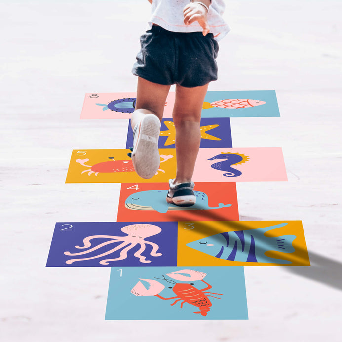 "- Nine hopscotch squares plus one placemarker toy - Leaves no residue on your floor Easy to apply and waterproof